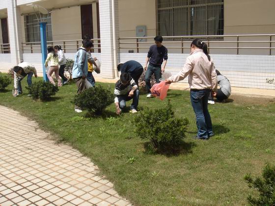 整个活动进行得规范有序,劳动气氛活跃,场面十分热闹。经过大约两个小时的努力,各教室焕然一新,草地上的白色垃圾已不见踪影,到处洋溢着春天的勃勃生机。 (数学系)