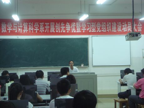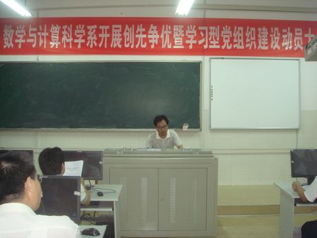 系主任罗李平同志就贯彻落实动员大会精神提出三点要求:要认真学习《数学与计算科学系深入开展创先争优活动实施方案》和《数学与计算科学系党总支推进学习型党组织建设的实施方案》,精心谋划,周密部署,为开展好“两个活动”奠定坚实基础;要深刻领会和准确把握推进学习型党组织建设的指导思想、基本原则和主要目标,以学习型领导班子建设带动学习型党组织建设,每位师生党员、干部都要模范学习践行社会主义核心价值体系;要准确把握创先争优活动的总体要求和主要内容,围绕学科、专业、课程建设精心设计创先争优活动载体,积极创新创先争优活动方式,每位师生党员、干部都要立足本职,在平时工作关键时刻、细微之处,课堂内外,自觉发挥先锋模范作用。