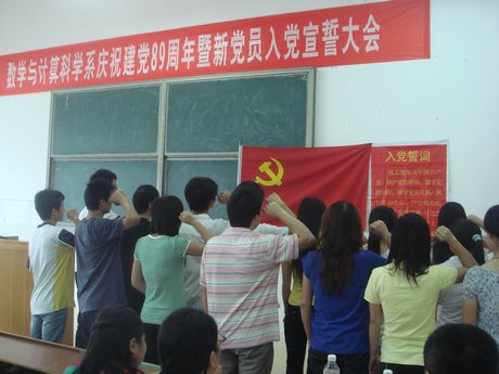 6 月28日上午9:30,数学与计算科学系在数学楼505举行庆祝建党八十九周年暨新党员入党宣誓大会。数学与计算科学系党总支周炎林书记、林琼副书记、系杨柳副主任及全体党员和学生干部出席本次大会。