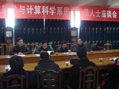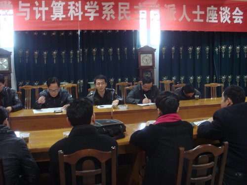 12 月14日下午4点半,数学与计算科学系召开民主党派人士座谈会(据悉,该系共有6位民主党派人士,分属两个民主党派:九三学社和民盟)。学院宣传统战部部长彭斌教授、数学与计算科学系党政领导及系部六位民主党派人士参加了座谈会。座谈会由数学与计算科学系主任罗李平教授主持。
