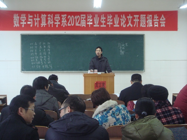 3 月3日上午,数学与计算科学系2012届毕业生毕业论文开题报告会在数学教学楼420室举行。系党总支书记周炎林、系主任罗李平教授、党总支副书记林琼以及数学与计算科学系全体专任教师与毕业生参加了报告会。报告会由数学与计算科学系副主任杨柳主持。