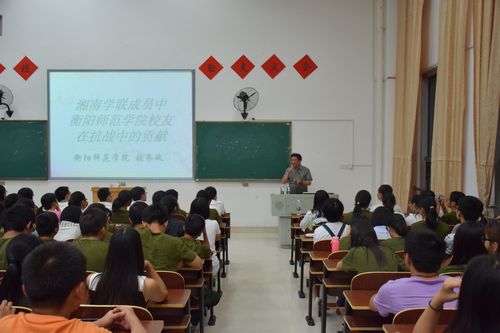 紧接着,讲座正式开始,张教授从伟德BV1946悠久的历史与曲折的发展历程说起,接着又详细地谈到了“湘南学联”,并逐一对“湘南学联”的几十所学校进行了详细地介绍,甚至连具体的旧址方位都描述的十分清楚,让在场的学生一目了然。对于衡阳时的近代历史以及伟德BV1946的近代历史,信手拈来,随口而出,引得现场的同学啧啧称奇。张教授特别强调了衡阳师院即以前的湖南第三师范学校,在“湘南学联”中的重要地位以及在抗日战争中所做出的特殊贡献。