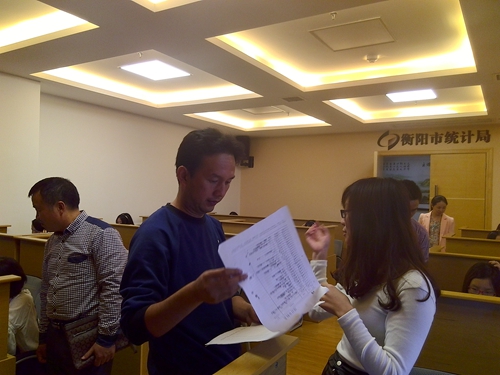 10月16日上午,在指导老师的带领下,统计学14级全体同学到达衡阳市统计局,该局工作人员为同学们进行了相关培训,让他们了解并学习了电话调查系统基本操作以及本次民意调查的目的、内容、流程及相关注意事项等,并要求所有同学当场亲身演示。培训活动结束后,按照班级成员分成3组,每组选定1名组长,负责本小组成员每天见习活动及交通安全等事宜。10月16日下午三点,实际调查工作正式开始。按照每天三个不同时间段,由各组组长分别召集本组成员在规定时间统一乘坐公交车到达统计局。在调查过程中,同学们通过电话先向住户居民说明来意,在取得同意和支持后,便以聊天的形式开展公众安全感调查,仔细询问问卷上的每一项问题,并及时记录信息,工作认真负责。