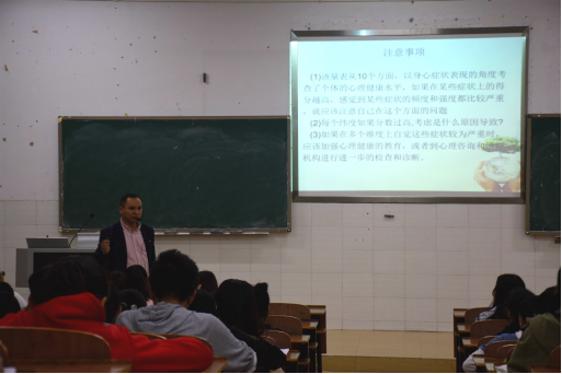 讲座中,周老师围绕90项症状清单自评量表scl-90症状自评量表各测评项进行了生动形象的讲解,让同学们对自己目前的心理状况有了一个初步的了解。同时,周老师指出心理测只能反映出近期的心理状况,其结果也只是代表一种“可能性”,不要给自己太大的思想包袱,也不要给自己对号入座,不随便给自己贴标签,但若有什么问题,也要及时进行心理咨询。其后,就大学生活中常见的困扰:自我困扰、学习困扰、人际关系困扰、生活困扰、职业发展目标困扰、情感困扰等向同学们提出了自己切实可行的建议和解决方案指出了同学们对于心理咨询所存在的误区。强调,适应是一种放弃,是一种接受,是一种,更是一种挑战如果适应不良,就可能会出现种种心理困惑,要改变我们能改变的,适应我们不能改变的。此外,希望同学们大学四年要学会欣赏别人,也要学会欣赏自己,定下目标,做好规划,并表示如果对于未来规划有迷茫,可以选择向大学生就业指导老师求助。