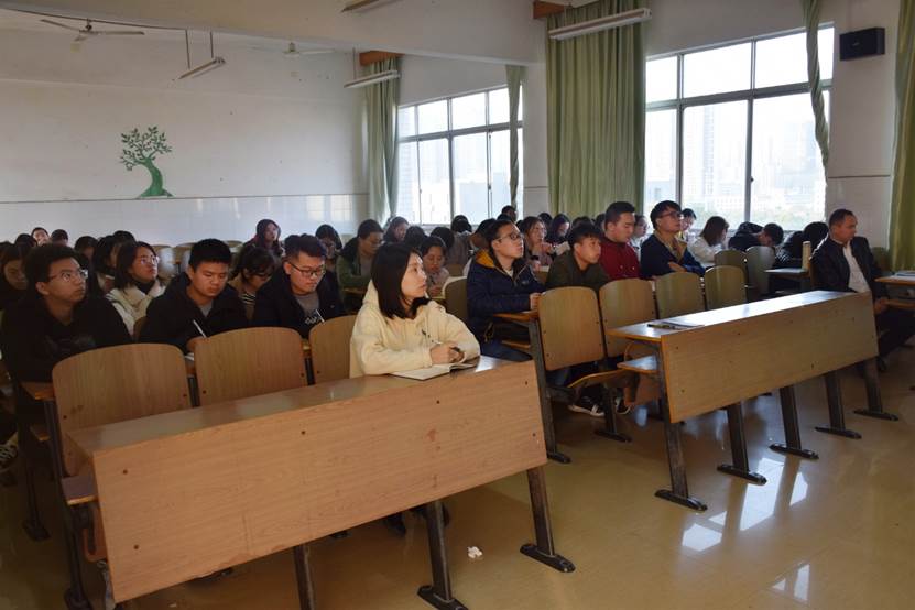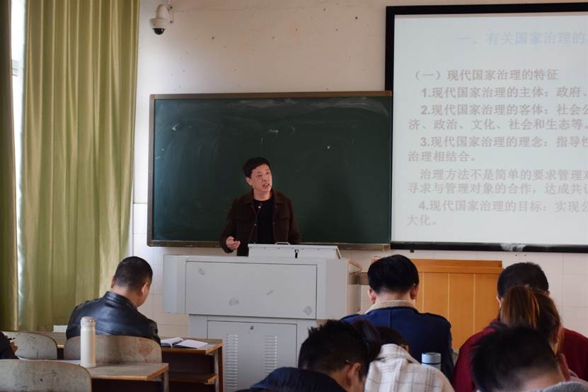 12月11日下午4点15分,我院党总支书记杨家骏在数学楼521教室给全院师生党员讲党课,这次党课的主题是“学习贯彻党的十九届四中全会精神”。