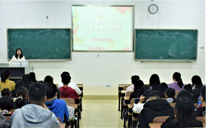 为深入学习贯彻落实中华全国学生联合会第二十七次代表大会会议精神,切实用习近平总书记贺信精神和党中央致词精神武装头脑、指导实践、推动工作,10月13日下午,院团委书记刘琴在理科楼一505教室为全院团学干部上了一堂以“学习全国学联二十七大会议精神”为主题的团课。