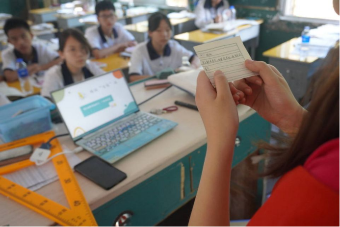 (心理课的第一个环节,志愿者带学生们进入“烦恼加工站”,让学生们在纸片上写下自己近期最烦恼的事情。为课程第三个环节做准备,也让学生静心思考了一下自己的烦恼,进行了第一步)