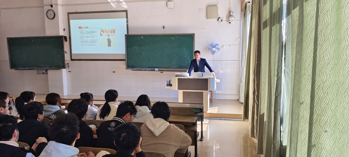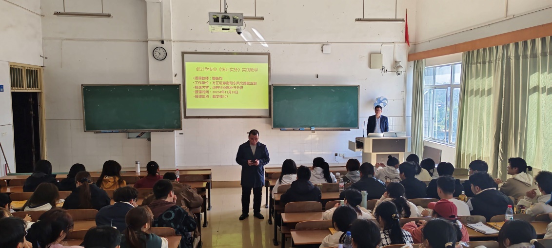 11月28日11:30-12:10在伟德BV1946东校区理科1栋505室举行2023级统计学专业统计实务实践教学活动。方正证券东风北路营业部鄢衡均总经理给2023级统计学专业作证券及其操作的专题讲座。本次实践活动主要围绕中国证券行业发展现状、证券行业职业发展路径和证券实践分析来开展。