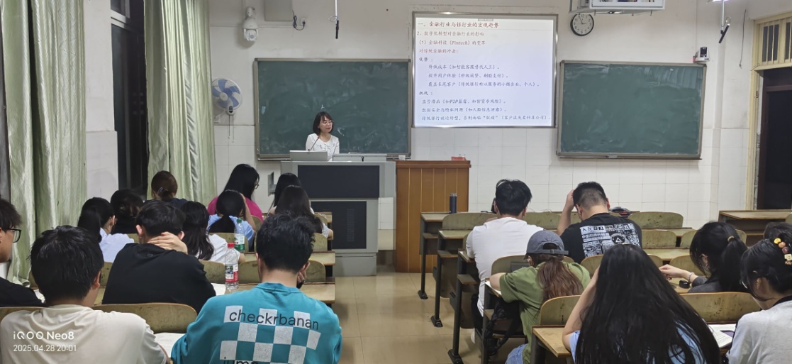 2025年4月28日,伟德BV19462023级统计学专业在理科一栋318教室开展《银行综合业务技能》实践教学活动。本次教学实践活动的主题是“金融行业就业前景与职业发展”,邀请讲座专家是中国农业银行前工作人员符湘凤。本次讲座由统计学专业负责人曹灿主持,2023级统计学一班和二班全体同学参加了本次讲座。