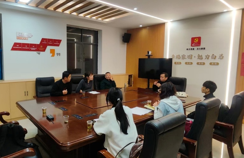 调研组一行首先前往村委会议室,对白马村总支委员、村委委员、九郎福柚合作社负责人赵兰进行了深入访谈。白马村总支委员、村务监督委员会委员程思远,村党总支委员沈屹峰等村干部共同参与交流。会上,赵兰主任详细介绍了当前九郎福柚的种植规模、市场销售及产业发展现状。