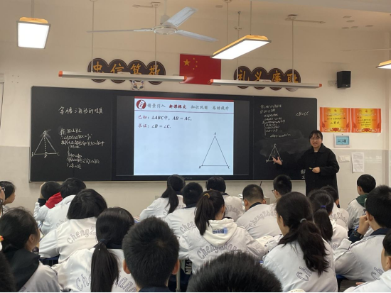 上午8点20分,领导老师们共同前往我院2018级学生向梦林的实习课堂听课指导。课堂上,向梦林以剪切拼接三角形为切入点,吸引同学们注意力的同时结合优美工整的板书一步一步激发起学生的求知欲。随后,她层层递进的讲解又让学生在轻松的课堂氛围中了解了等腰三角形的性质,感受到几何数学的美。课后,在场老师进行点评,纷纷提出了宝贵的建议。其中,阳院长点出本堂课的“三有两不足”,即课堂有法、有效、有趣,结构分明,运用数形结合的思想,充分体现了数学核心素养,增添了课程趣味性。但同时需要注意保护学生的积极性,提高对时间的把控能力。紧接着,李院长就授课细节方面指出课堂习题布置顺序问题以及使用专业数学语言的重要性。最后,宫老师指出教师应多关注学生的成长,尤其是后进生,更应该鼓励他们积极参与课堂互动,开拓思维,明确目标。