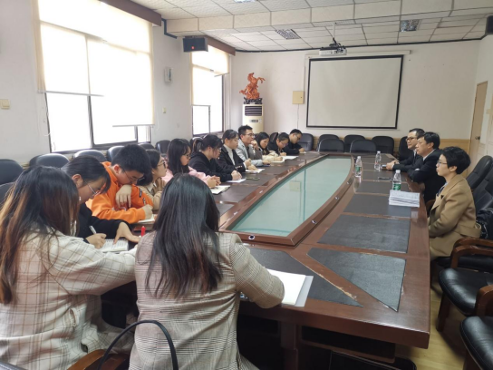 随后,各位领导老师与2018级成章实验中学实习生于会议室进行交流考察,对18级实习生的实习成果进行评价并给予相应的指导。阳院长从课堂目标、课堂引导、情境创设、课堂氛围等八个方面提出建议,提出教师应具备数学的核心素养,运用数形结合等方式授课,导入趣味互动,培养学生直观想象于逻辑推理能力。其余老师也都大方分享自己的授课经验,为在座18级实习生们答疑解惑。