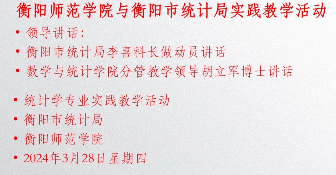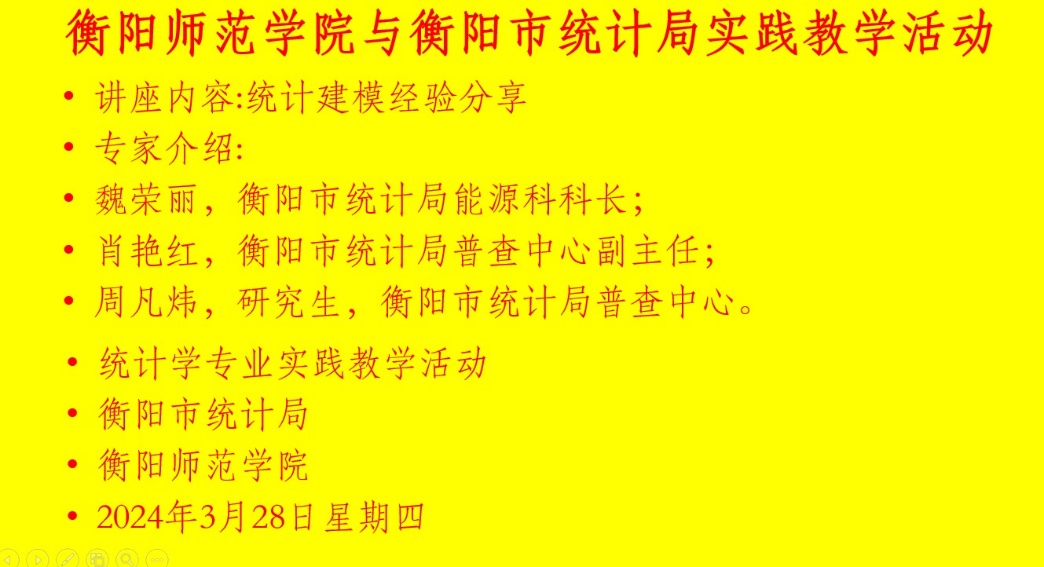 首先,曹灿老师热情欢迎衡阳市统计局组织人事科科长李喜、衡阳市统计局能源科科长魏荣丽、衡阳市统计局普查中心副主任肖艳红、湖南工学院应用统计教研室主任刘娟参加本次经验分享大会。曹灿老师详细的介绍了各位专家的情况,同时介绍了本次讲座的主要内容。曹老师希望同学们认真领悟讲座的主要内容,进一步了解和熟悉统计建模大赛,争取在本次大赛中获得较好成绩。
