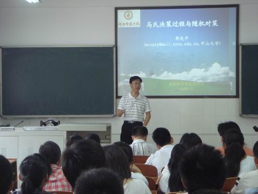 515下午300,中山大学博士生导师郭先平教授应邀在我院东校区计算机楼310室作了一场十分精彩的学术报告。学院组织部部长聂东明部长、数学与计算科学系部分教师及08级信息与计算科学专业一、二班的学生参加了此次报告会,此次报告的主题是《马氏决策过程与随机对策》,报告会由系主任罗李平教授主持。