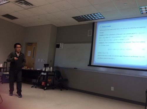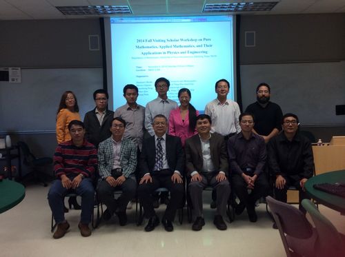 11 月8日,乔志军教授和冯兆生教授联合举办了德克萨斯大学泛美分校2014年度访问学者学术研讨会“纯纯数学和应用数学及其在物理学和工程方面的应用”。此次学术研讨会邀请德克萨斯大学泛美分校Jasang Yoon博士、韩国Incheon 国立大学的Hyoun Kim博士、内蒙古师范大学扎其拉教授、岭南师范学院吴勇旗教授、大连理工大学段玉平博士、北京航天航空大学孙兵博士、河海大学蒋永新博士、兰州大学杨变霞博士等做了12场学术报告。 应乔志军教授和冯兆生教授的邀请,我系罗振国博士也参加了此次研讨会,并做了一场30分钟的题为“Existence of positive periodic solutions for a nonautonomous neutral delay n-species competitive model with impulses” 的学术报告。学术报告后,就相关问题与各位专家进行了深入的交流探讨,受益非浅。