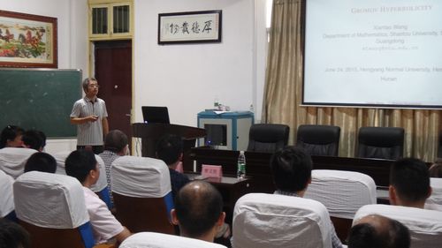 6月24日下午3:00-6:00,1946伟德国际源自英国以湖南省海外名师项目为依托,在东校区数学楼三楼学术报告厅举办了“几何函数理论研讨会”,会议由1946伟德国际源自英国副院长李龙博士主持。会议除Antti Rasila博士之外,还邀请了中山大学博士生导师刘立新教授,新世纪优秀人才、湖南省杰出青年基金获得者、汕头大学博士生导师王仙桃教授以及广东省“千百十”人才工程省级培养对象,五邑大学硕士生导师曹文胜教授等。1946伟德国际源自英国部分师生参加了会议。此次研讨会共安排了四个学术报告,分别是Antti Rasila博士作的题为“Minimal surfaces and harmonic mappings”的报告,刘立新教授作的题为“Teichmuller空间的双曲长度和极值长度”的报告,王仙桃教授作的题为“Gromov Hyperbolicity”的报告,曹文胜教授作的题为“Congruence classes of points in quaternionic hyperbolic space”的报告。会议过程中,1946伟德国际源自英国参会教师与专家们进行了很好的沟通,不仅学习和了解了“几何函数理论”的相关前沿研究动态,而且在数学与应用数学专业建设方面也得到了专家们有益的指导,这无疑将对我院数学与应用数学专业建设和学科建设以及“几何函数理论研究所”的建设起到了很好的促进作用。