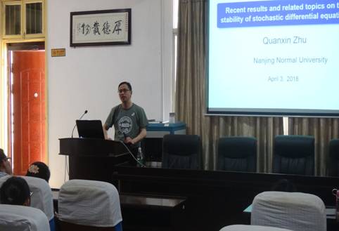 2018年4月3日下午,南京师范大学数学科学学院博士生导师朱全新教授应邀在数学楼三楼学术报告厅作了题为“Recent results and related topics on the stability of stochastic differential equations”的学术报告,我院部分教师和学生参加并认真聆听了此次报告,报告会由我院副院长李浏兰博士主持。