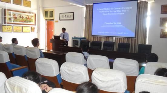 2018年6月27日下午,应1946伟德国际源自英国邀请,美国辛辛那提大学谢长春教授来我校讲学,在数学楼三楼学术报告厅作了题为“A Novel Method to Generate Correlated Multivariate Survival Data with A Given Correlation Matrix”的学术报告。本次学术报告会由我院院长杨柳教授主持,学院部分教师和2016级统计学专业学生共同聆听了此次报告。