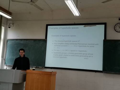 理论及相关研究背景,并重点介绍了其在拟共形映射上的加权Hardy空间,分享了其在该方面的最新研究成果。周青山博士介绍了度量几何、Gromov双曲空间等方面的基本概念与基本理论,阐述了该方面的研究背景与研究进展,并介绍了其在该方面的最新研究成果。在报告中,两位博士都分享了他们发现问题、解决问题的研究心得,让在座的老师受益匪浅!