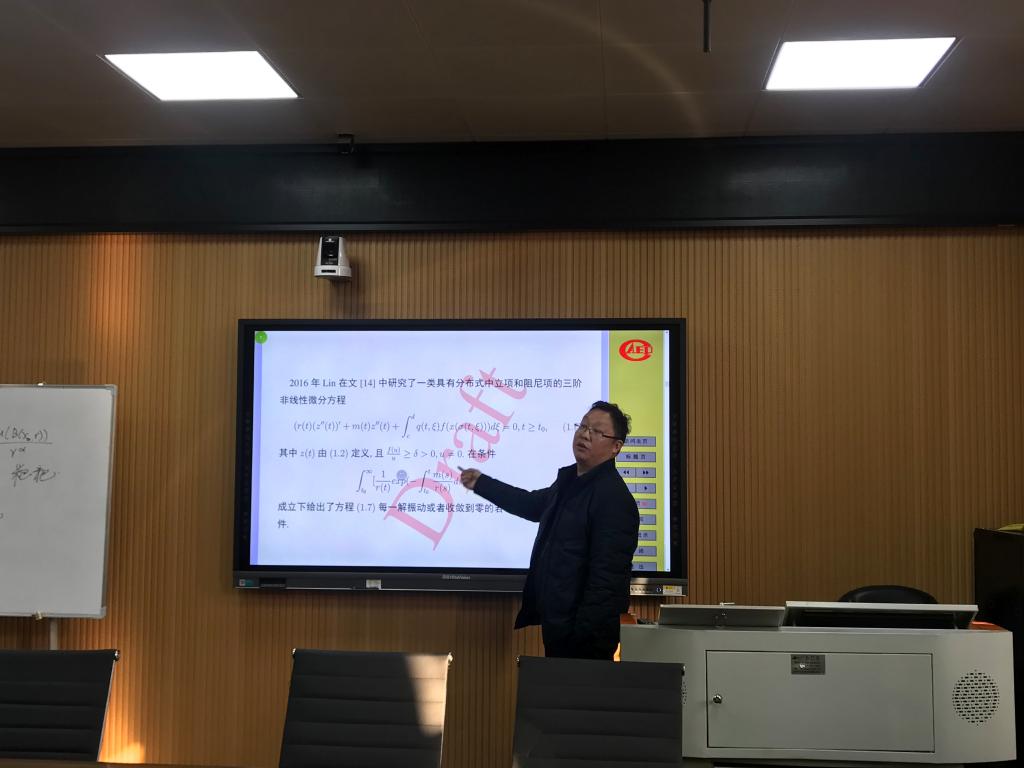随后曾云辉副教授作了题为“具阻尼项的三阶韭线性中立型泛函微分方程的振动性和渐近性”的学术报告,他首先介绍了Emdon-Fhower方程的物理背景,深入讲解了该问题有关振动解的存在性的研究现状及研究进展,并介绍了自己近期的主要工作和研究成果。报告结束后,曾老师还分享了自己做科研和撰写中文稿件的一些经验和体会,并就相关问题与老师们进行了积极的交流,大家对这一研究方向有了更深入的了解。