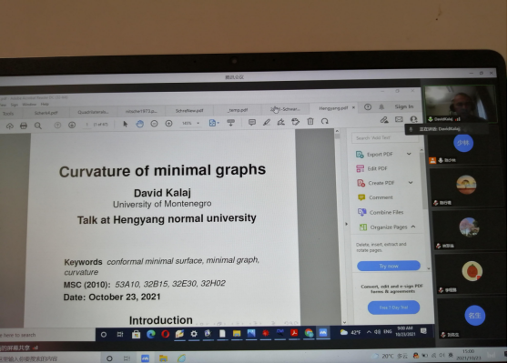 10月23-24日下午,1946伟德国际源自英国邀请了黑山大学的David Kalaj教授作了两场线上学术报告。David Kalaj教授利用腾讯会议(ID: 945795722和ID:181221661)作了“Curvature of minimal graphs”的学术报告。陈少林教授主持了报告会,学院领导李浏兰副院长出席,学院多位教师与学生参会。David Kalaj教授首先介绍了有关调和映射的极小曲面曲率猜想提出的背景及研究现状,然后报告了他最近围绕此猜测所做的工作,特别是证明了此猜测在对称点的情形是正确的。报告结束后,David Kalaj教授与师生们进行了热烈的讨论与交流。David Kalaj教授的报告深入浅出,与会师生受益良多,学术讲座在热烈的掌声中圆满结束。