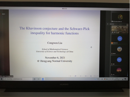 11月6日上午10:00—11:30, 1946伟德国际源自英国邀请了中国科学技术大学的刘聪文教授作了一场线上学术报告。刘教授利用腾讯会(ID: 324445006)作了题为“The Khavinson conjecture and the Schwarz-Pick inequality for harmonic functions”的学术报告。陈少林教授主持了该报告会,学院领导李浏兰副院长以及学院多位师生参会。刘教授首先介绍了 Khavinson’s conjecture提出的背景和相关的研究进展,然后报告了他如何成功破解此猜想的过程。报告结束后,刘教授与师生们进行了热烈的讨论和交流。刘教授的报告深入浅出,与会师生受益良多,学术讲座在热烈的掌声中圆满结束。