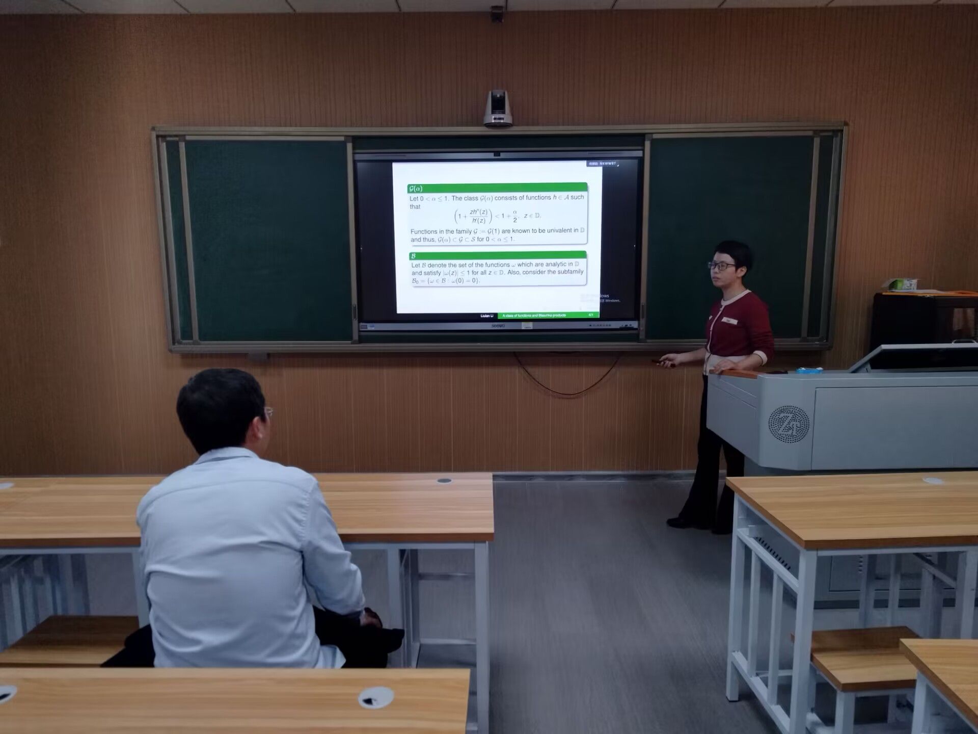 其后,李浏兰副院长作了题为“A class of functions and Blaschke products”的学术报告。李院长在报告中首先简要介绍了目前对此问题的研究现状,然后她指出我们通过使用 Schwartz 函数来考虑一类函数的性质,并探讨它与 Blaschke 积的关系。