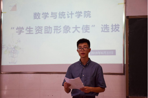 为全面落实党和国家的学生资助政策,加大学生资助宣传,我院于6月22日下午4点半在数学楼406举行以“幸福资助,伴我成长”为主题的“学生资助形象大使”选拔赛。本次大赛特邀我院党总支副书记谭全球、辅导员周长恩及分团委学生分会各部长出席并担任评委。