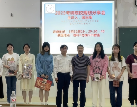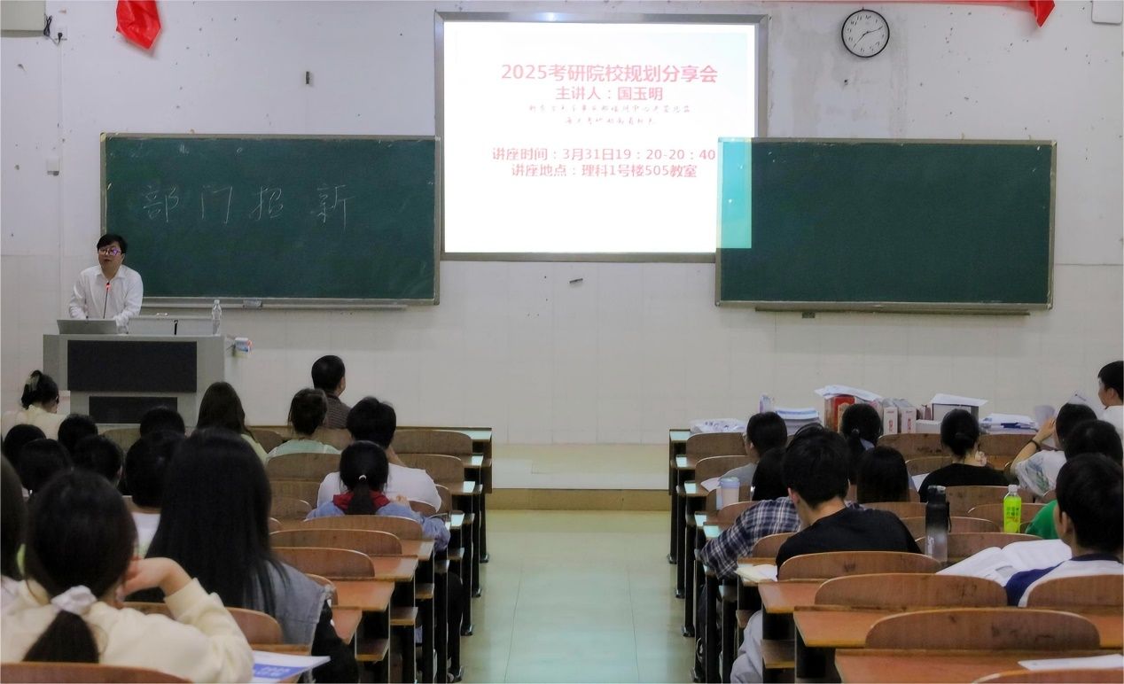 接着,国玉明老师就近年考研形势展开分析,指出当下考研人数下降,调剂人数多且难的情况,他强调了考研的“择校环节”,阐明根据自身情况选择院校的重要性,就考研报名-考试-复试-调剂展开详细介绍,建议同学们尽早确定考研目标学校。随后,国老师对政治、英语、专业课各科复习方法、进度等进行了详细指导,他建议同学们多进行真题模拟训练,熟悉考试题型和解题思路,根据自己的实际情况制定详细的复习计划,并严格按照计划执行。