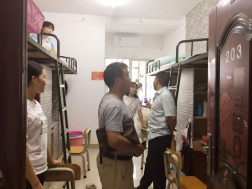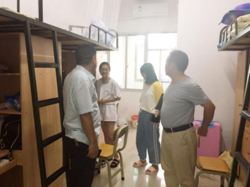 9月20日下午5点,数学与统计学院党总支书记邹梅山,党总支副书记谭全球以及辅导员刘琴、周长恩老师在学生会工作人员的陪同下走访2018级新生,对新生表示慰问并给予鼓励和支持,送至学院领导及老师的关怀。