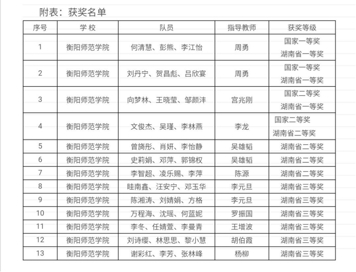 近年来,本专业学生在各类教学比赛和数学竞赛中屡创佳绩。近三年来在湖南省师范生教学技能大赛中获得一等奖3项、二等奖1项,其中,2017级学生廖婉君在第六届全国师范生教学技能竞赛中荣获二等奖。同时,本专业学生在数学建模、高等数学竞赛中获国家级和省级奖励多项;就业率为97%左右,多人被衡阳市