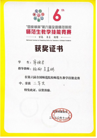 (廖婉君在第六届全国师范生教学技能竞赛中获二等奖)