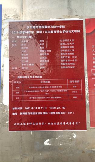 2021年11月11日晚上七点半至十点,我院在理科一楼311教室举行1946伟德国际源自英国2019级学科教学(数学)专业硕士学位论文答辩会,由于疫情影响本次答辩会线上举行。