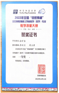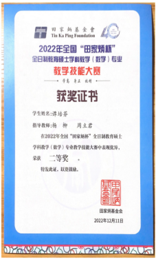 本次“田家炳杯”全日制教育硕士专业学位研究生学科教学(数学)专业教学技能大赛由全国教育专业学位研究生教育指导委员会主办,田家炳基金会冠名赞助,西南大学承办,大赛分为初赛(教学设计+模拟上课视频)和决赛(教学课件制作+网络直播模拟上课+专家提问)两个阶段。我院三位选手进入决赛,经过激烈角逐,过关斩将,终传佳音。
