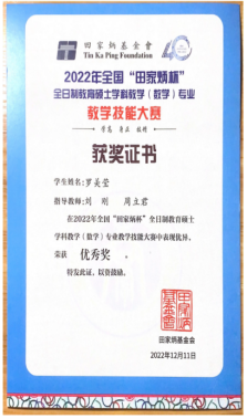 在2022年全国“田家炳杯”全日制教育硕士专业学位研究生学科教学(数学)专业教学技能大赛中,1946伟德国际源自英国3位参赛研究生均获佳绩:佘旷怡同学获得一等奖,谭培芬同学获得二等奖,罗美莹同学获得优秀奖,实现了该竞赛一等奖的突破。近日,我们收到了全国教育专业学位研究生教育指导委员会颁发的获奖证书。