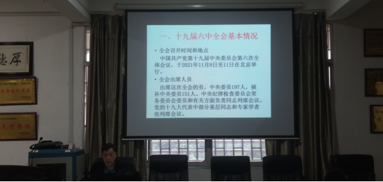 11月17日下午,我院在理科1楼三楼会议室传达学习党的十九届六中全会精神,学院全体教职工参加了学习。我院党总支书记杨家骏主持学习会议并作学习辅导报告。